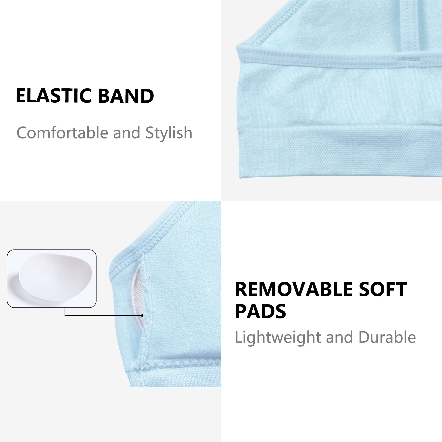 Design - These colorful and comfortable training bras feature REMOVABLE padding for added support and modesty. These bras are designed to offer great fits, maintain shape, and enhances mobility. Pullover style for convenient wear